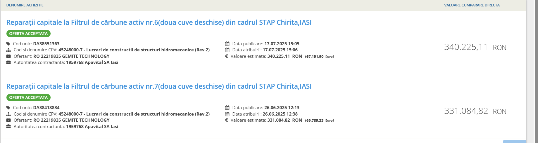 În cursul anului 2025, firma Gemite Technology a încheiat alte două contracte cu societatea Apavital SA Iași. Ambele contracte au fost încheiate prin încredințare directă. În iunie și iulie anul trecut, Apavital SA a avut cu Gemite Technology contracte privind „reparații capitale la filtrul de cărbune de la stația Chirița, precum și demontarea unor plăci sau regeometrizarea unor grinzi. Pentru contractul din 26 iunie 2025, Apavital SA și Gemite Technology s-au înțeles la 331.084 lei, fără TVA (peste 65.000 euro). Pentru contractul din 17 iulie 2025, cele două părți s-au înțeles la un preț de 340.225 lei, sumă fără TVA (peste 67.000 de euro).