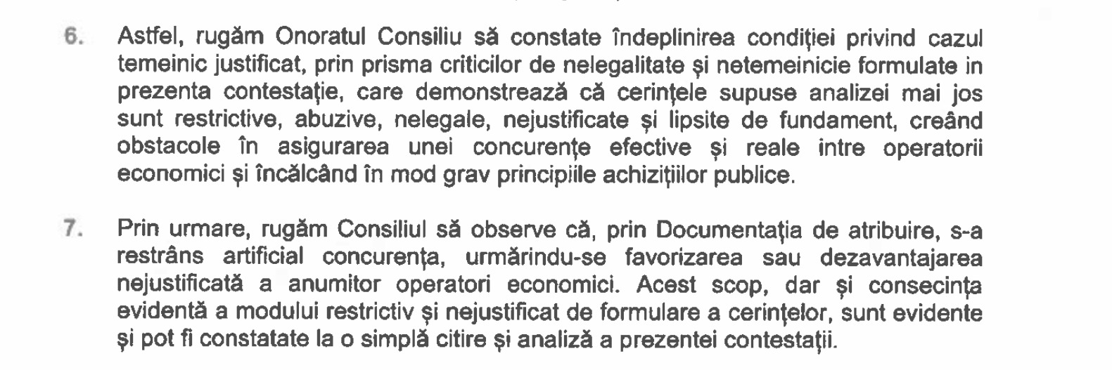 „Prin documentația de atribuire s-a restrâns artificial concurența, urmărindu-se favorizarea sau dezavantajarea nejustificată a unor operatori economici. Acest scop, dar și consecința evidentă a modului restrictiv și nejustificat de formulare a cerințelor, sunt evidente și pot fi constatate la o simplă citire și analiză a prezentei contestații”.