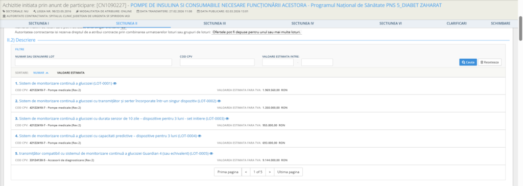 Spitalul Sf. Spiridon a demarat procedura privind achiziția de pompe de insulină și consumabile necesare funcționării acestora în data de 27 februarie 2026. Valoarea estimată este de 203.322.408 lei (39.916.000 euro). Licitația a fost împărțită în 23 de loturi și vizează un acord cadru pe 24 de luni. Doar că unul dintre potențialii participanți, Glucopro SRL București, a depus o contestație la CNSC prin care acuză că achiziția este croită pentru unul din furnizorii clasici ai spitalului ieșean, Medtronic România SRL.