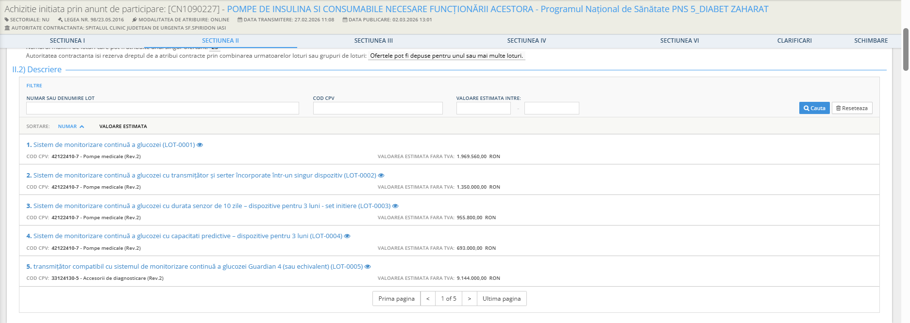 Din loturile de peste 200.000.000 lei, firma contestatoare a ofertat loturi de peste 60.000.000 lei. Glucopro SRL a depus oferte pentru lotul 1- Sistem de monitorizare continuă a glucozei (valoare de 1.969.560 lei), lotul 2- Sistem de monitorizare continuă a glucozei cu transmițător și serter încorporate într-un singur dispozitiv (1.350.000 lei). Firma a depus ofertă și pentru lotul 6- Senzori compatibili cu sistemul de monitorizare continuă a glucozei Guardian 4 (sau echivalent)- 28.137.600 lei și pentru lotul 7- Materiale consumabile pentru sistem de monitorizare continuă a glicemiei cu transmițător și sertar încorporate într-un singur dispozitiv- 30.000.000 lei.