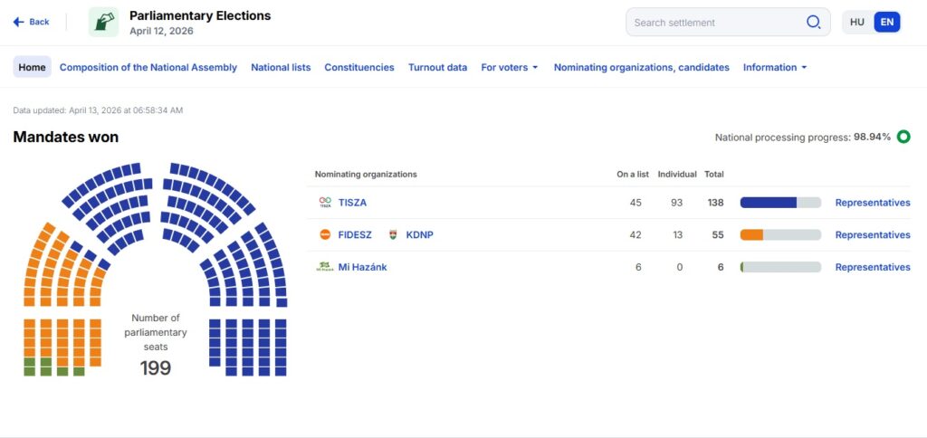 UPDATE 06.30 Partidul Tisza al lui Peter Magyar se îndreaptă în continuare spre obținerea unei majorități calificate în parlamentul maghiar, cu puțin sub 99% din voturi numărate. Se estimează că va câștiga 138 de locuri, față de cele 55 ale alianței actuale Fidesz-KDNP, condusă de Viktor Orbán. Partidul de extremă dreapta Mi Hazánk Mozgalom, sau Mișcarea Patria Noastră, este de așteptat să obțină cele șase locuri rămase. Până în prezent, au fost numărate 98,93% din voturi.