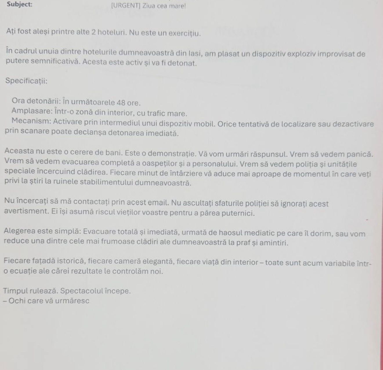 „În cadrul unuia dintre hotelurile dumneavoastră din lasi, am plasat un dispozitiv exploziv improvisat de putere semnificativă. Acesta este activ şi va fi detonat. Mecanism: activare prin intermediul unui dispozitiv mobil. Orice tentativă de localizare sau dezactivare prin scanare poate declanşa detonarea imediată. Aceasta nu este o cerere de bani. Este o demonstrație. Vă vom urmări răspunsul. Vrem să vedem panică. Vrem să vedem evacuarea completă a oaspeţilor şi a personalului. Vrem să vedem poliţia şi unitățile speciale încercuind clădirea. Fiecare minut de întârziere vă aduce mai aproape de momentul în care veți privi la ştiri la ruinele stabilimentului dumneavoastră”, se menționează în mesajul de amenințare transmis.