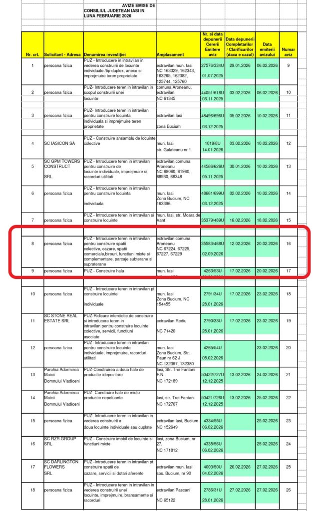 Pe 20 februarie, Consiliul Județean Iași a emis „avizul unic” pentru un Plan Urbanistic Zonal (PUZ) realizat în vederea construirii a două turnuri înalte de 30 metri pe malul lacului Aroneanu. Unul dintre beneficiarii acestui PUZ este Florin Alexe, fratele lui Costel Alexe, care a semnat un antecontract de vânzare-cumpărare pentru o parcelă de teren pe care se intenționează construirea unuia dintre cele două blocuri. Terenul era înregistrat însă ca „pădure” și a fost scos din fondul forestier printr-o decizie a Gărzii Forestiere din iulie 2022, însă cu o destinație precisă care nu putea fi modificată: „realizarea obiectivului Structură de primire turistică cu funcțiuni de cazare”. Inițiatorii PUZ-ului au apelat la un tertip pentru a masca adevărata destinație a blocurilor cu apartamente, birouri și spații comerciale. În document, apartamentele au fost botezate „spații colective de cazare”. „Aceste unități de cazare nu aparțin aceluiași proprietar/persoane fizice sau juridice, ci pot avea mai mulți proprietari și sunt administrate de fiecare în parte”, se arată în PUZ-ul care a primit avizul Consiliului Județean. În același proiect imobiliar este asociat și dezvoltatorul imobiliar Paul Avătăji