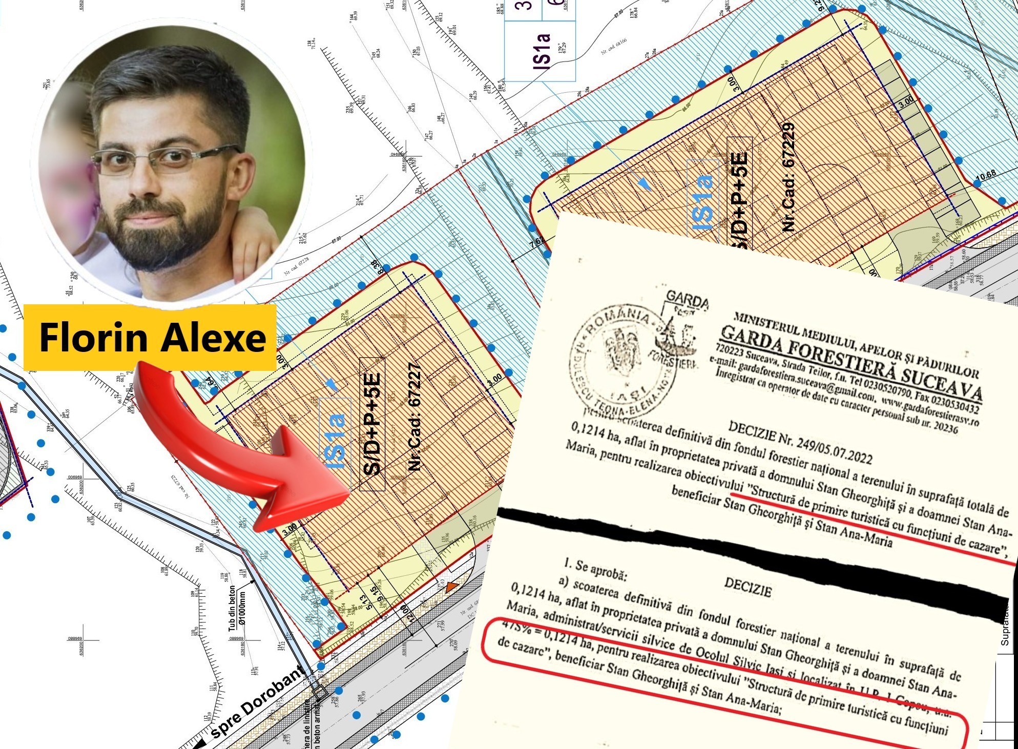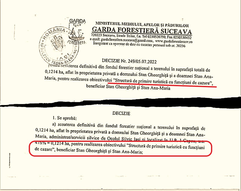 În acte, unul dintre terenurile care face obiectul Planului Urbanistic Zonal aparține soților Gheorghiță și Ana-Maria Stan. La data de 5 iulie 2022, la solicitarea acestora, Garda Forestieră Suceava a emis Decizia nr. 249 privind scoaterea definitivă din fondul forestier național a terenului. Însă decizia prevede și destinația pentru care terenul a fost scos din fondul forestier, iar această destinație nu poate fi modificată. Conform documentului, terenul a fost scos din fondul forestier național „pentru realizarea obiectivului Structură de primire turistică cu funcțiuni de cazare”.
