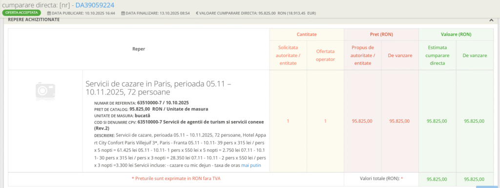 Instituția subordonată municipalității finanțează și de această dată deplasările externe ale fostului director. Una dintre acestea va avea loc în luna noiembrie, la Paris. Apreotesei, Fermeșanu și Guzgă vor susține pe 7 noiembrie un concert la Biserica Saint Ettiene du Mont, alături de Orchestra Metropolitană Iași. Pentru perioada 5-10 noiembrie 2025, Ateneul Iași a plătit 116.000 lei (peste 23.000 de euro) pentru cazarea a 72 de persoane la Appart City Confort Hotel Vilejuif, stabiliment de trei stele, din Capitala Franței. Ateneul a plătit banii firmei de turism Alfatravel, administrată de Mihaela Gheorghiță.