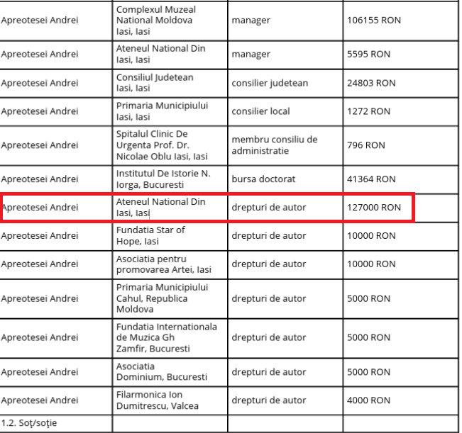 127.000 lei – drepturi de autor de la Ateneu pentru Apreotesei. Ca manager încasa doar 80.000 lei