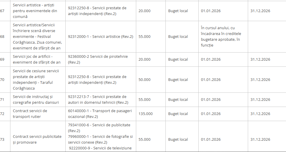 Servicii artistice/Servicii închiriere scenă diverse evenimente – Festival Coraghiasca, Ziua comunei, eveniment de sfârșit de an – 55.000 lei