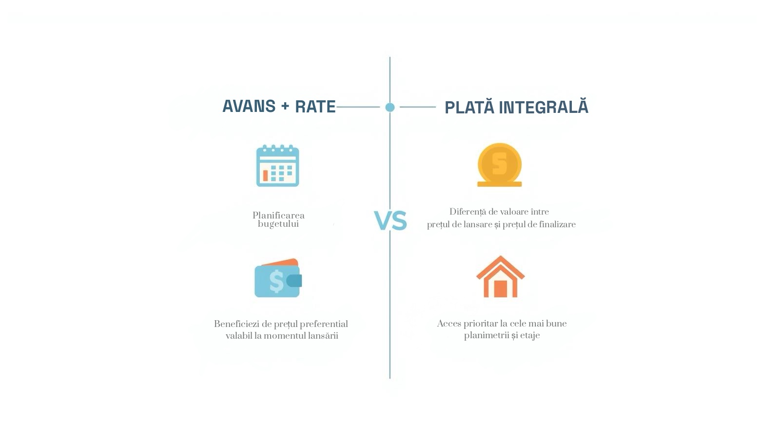 ● Rate lunare sau trimestriale direct la dezvoltator, eliminând sau reducând nevoia unui credit ipotecar.
