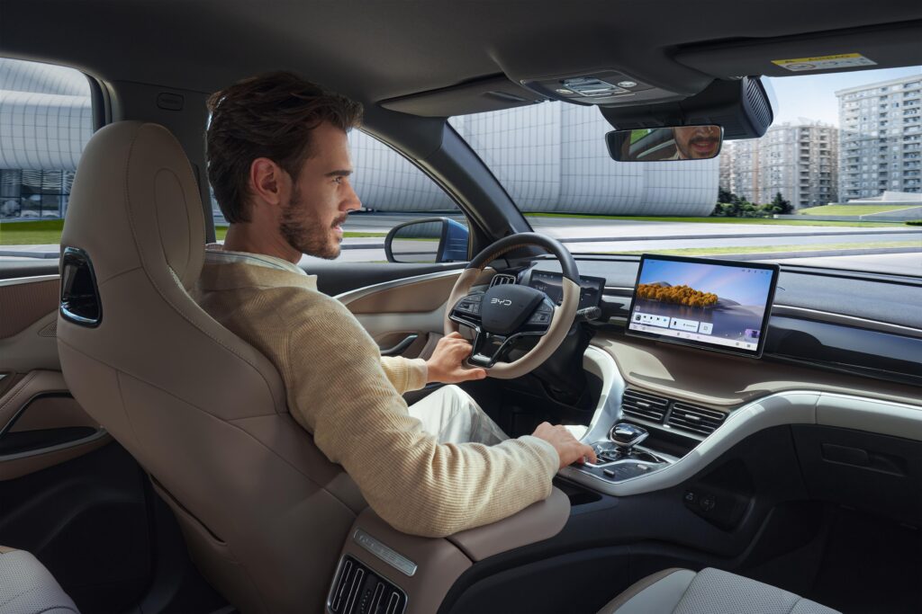Panoul de bord integrează un instrumentar digital de 8,8 inch pentru informațiile esențiale de condus și un ecran tactil de 12,8 inch, de înaltă rezoluție, care rulează cea mai recentă generație a sistemului de infotainment BYD. Acesta oferă comenzi vocale „Hi BYD”, conectivitate Apple și Android, precum și o interfață personalizabilă cu acces rapid la funcțiile principale. Controlul climatizării este intuitiv și poate fi realizat prin gesturi simple, chiar și în timpul condusului.