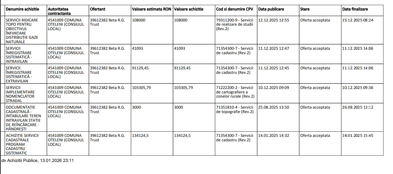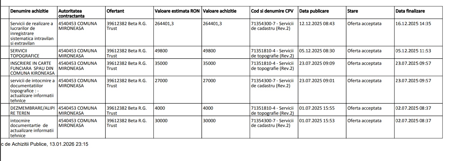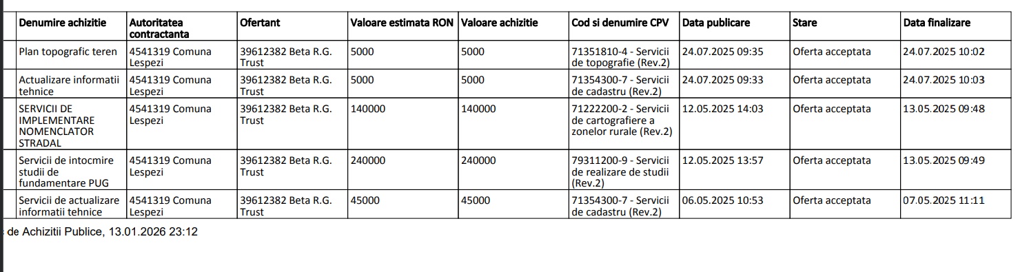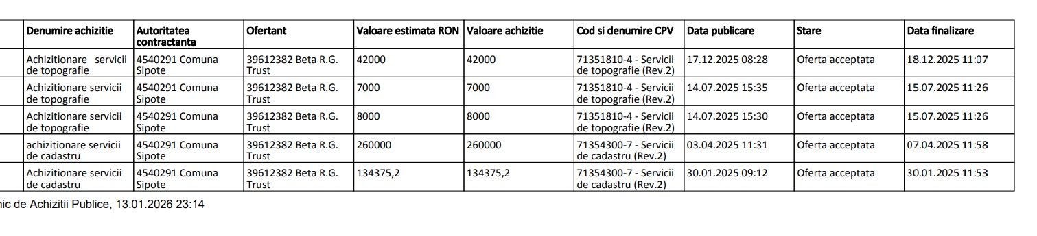 În 2025, Beta.R.G. Trust a avut încheiate 67 de contracte cu primării din județele Iași, Neamț și Bacău cu o valoare cumulată de peste 4 milioane de lei + TVA. Mare parte dintre comunele care i-au direcționat fără licitație contractele pentru servicii cadastrale sunt conduce de primari PSD, colegi de partid și prieteni cu Costel Hugianu.