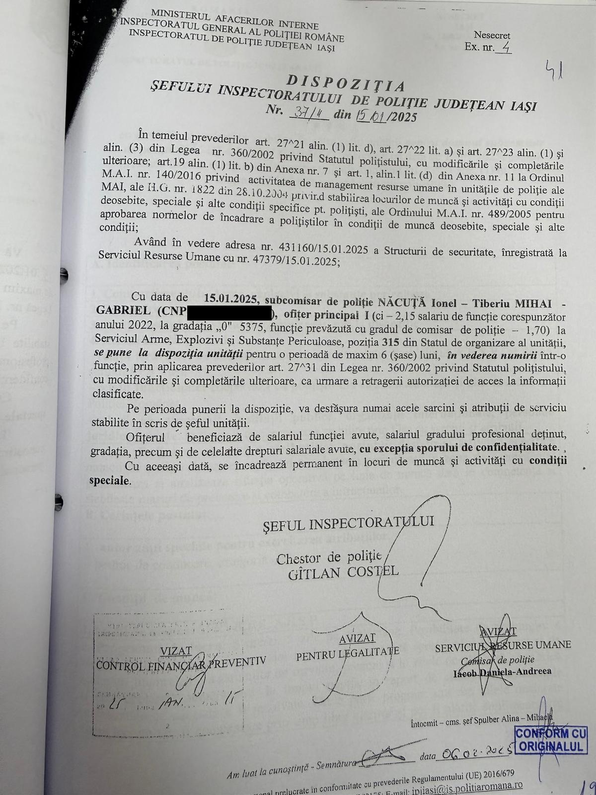 Din documentele atașate la prezenta, reies informații concrete, complete și care confirmă că există un risc în a-i mai fi acordat reclamantului accesul la înscrisuri secret de serviciu, risc care de fapt face obiectul dosarului penal, care îi afectează în mod negativ credibilitatea și capacitatea de a păstra secrete, pentru care apreciem oportună decizia de a retrage autorizația de acces la informații secret de serviciu și a nu dispune îndeplinirea unor sarcini și atribuții care presupun accesul la informații de serviciu”, se arată în documentele depuse de IPJ Iași la dosarul deschis de către subcomisarul Năcuță.