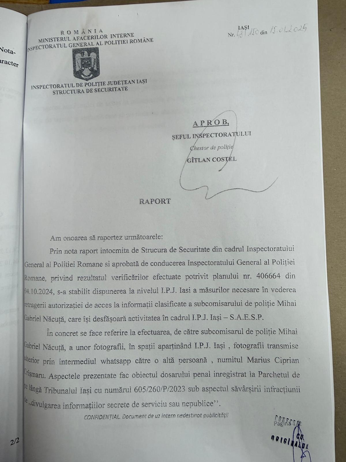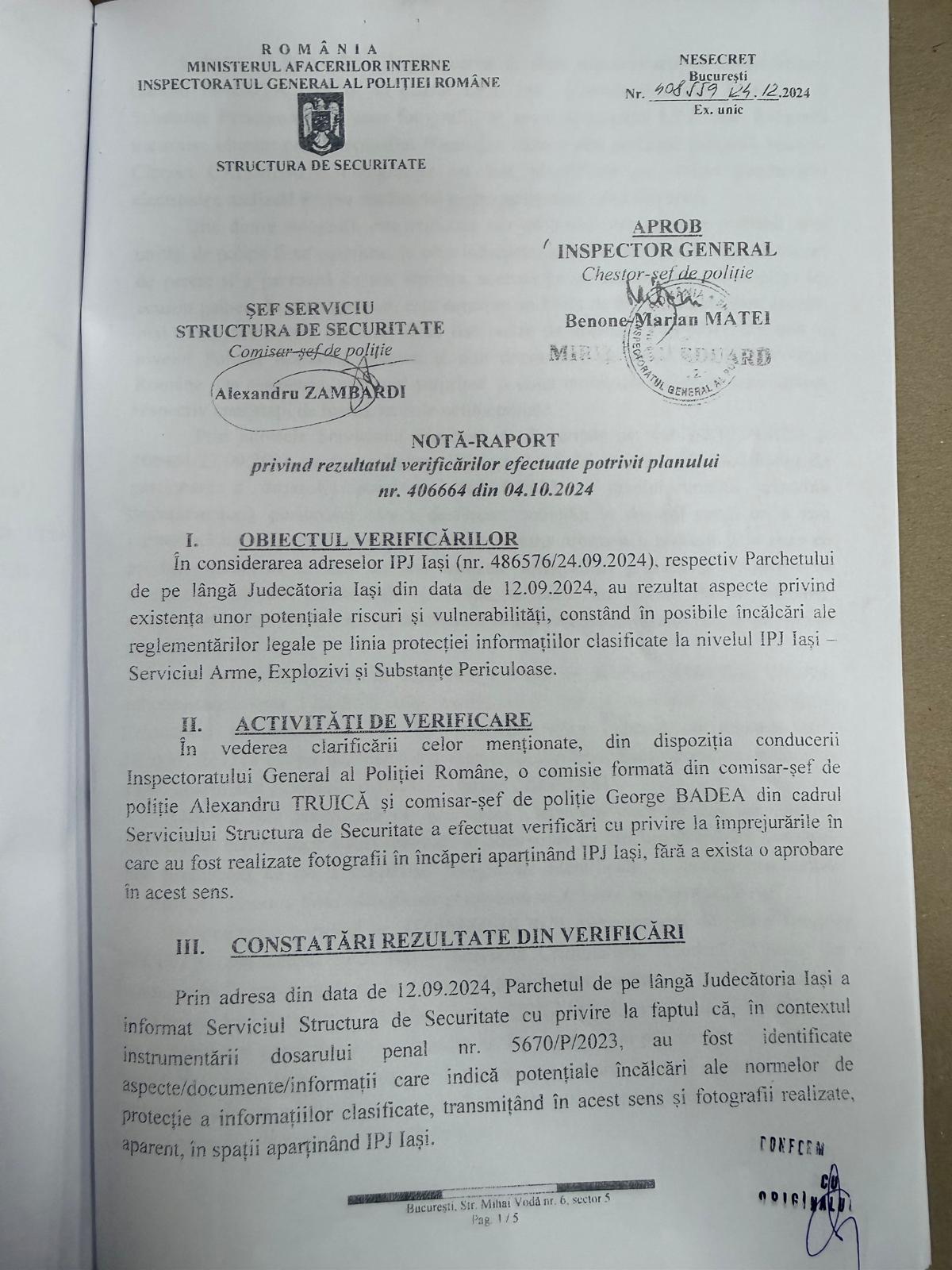 (…) Parchetul de pe lângă Judecătoria Iași a informat Serviciul Structura de Securitate cu privire la faptul că, în contextul instrumentării dosarului nr. 5670/P/2023, au fost identificate aspecte/documente/informații care indică potențiale încălcări ale normelor de protecție a informațiilor clasificate, transmițând în acest sens și fotografii realizate în spații aparținând IPJ Iași.