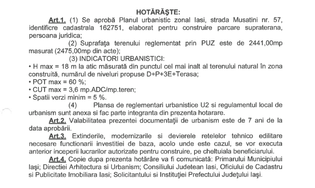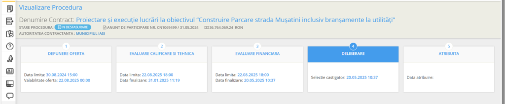 Primăria Iași refuză să semneze contractul de aproximativ 30.000.000 lei pentru construirea primei parcări publice supraterane din oraș, din strada Mușatini. Asocierea care a câștigat licitația a făcut plângere la CNSC, solicitând obligarea primăriei la semnarea contractului și demararea lucrărilor. Primăria invocă o petiție a locuitorilor din zonă, condiționând semnarea contractului de rezultatul unei așa-zise dezbateri publice și mutarea amplasamentului. Doar că dezbaterea publică pentru construirea parcării cu 280 locuri a fost organizată chiar de către Primăria Iași în 2023, în faza prealabilă de aprobare a Planului Urbanistic Zonal. Conform documentului făcut public pe site-ul municipalității, în ianuarie 2023, „după obținerea datelor de contact ale proprietarilor parcelelor vecine pe toate laturile parcelei care a generat P.U.Z-ul, s-au expediat prin Poşta Română adrese poştale – anunţuri cu privire la Planul urbanistic zonal-Iasi. Pe adresa instituției noastre nu s-au primit propuneri sau sugestii privind propunerea urbanistică”