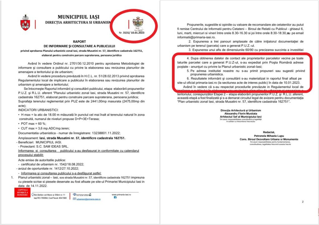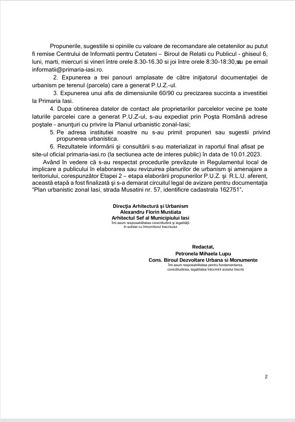 În data de 10 ianuarie 2023 a fost întocmit un raport de consultare a publicului cu privire la elaborarea planului urbanistic zonal (PUZ) pentru parcarea din Mușatini. În document se arată că informarea a fost emisă în noiembrie 2022, au fost expuse panouri și afișe pe parcela din strada Mușatini și la blocurile din zonă, iar pe adresa primăriei „nu s-au primit propuneri sau sugestii privind propunerea urbanistică”. Planul urbanistic zonal (PUZ) al parcării din strada Mușatini 57 a fost aprobat în ședința Consiliului Local din februarie 2023, ceea ce a dus la demararea procedurii de achiziție publică.