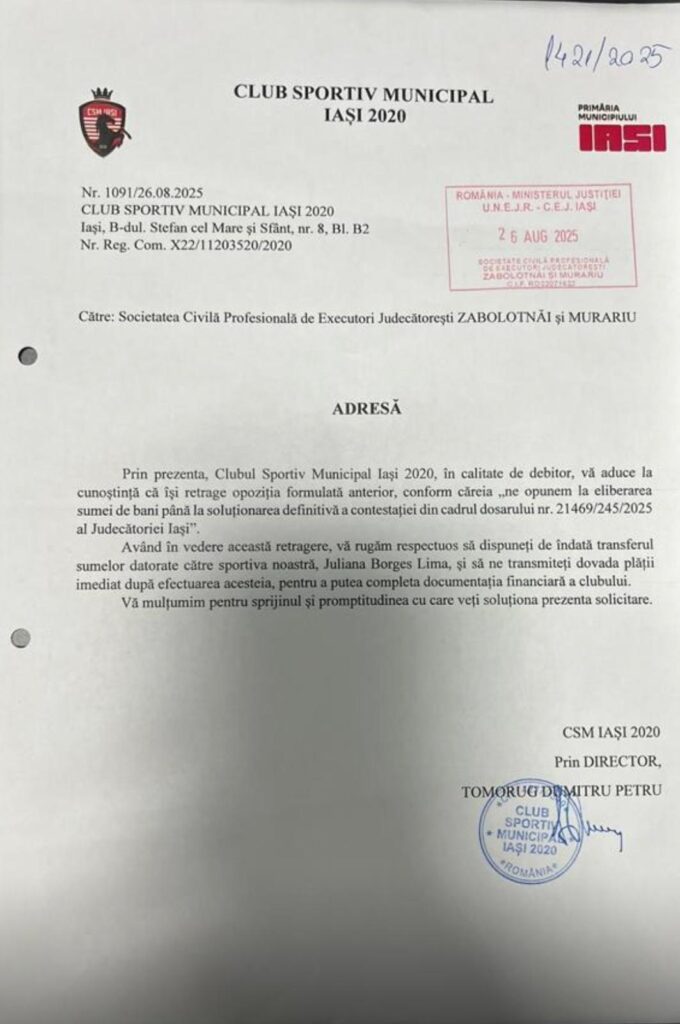 26 august 2025, în mod suspect, CSM trimite o adresă semnată de Dumitru Tomorug către executorul judecătoresc prin care informează că renunță la opoziția făcută în dosarul de executare (afectațiunea specială) și cere efectuarea de urgență a sumelor poprite către sportiva din Brazilia. „Prin prezenta, CSM Iași 2020, în calitate de debitor, vă aduce la cunoștință că își retrage opoziția formulată anterior, conform căreia ne opunem la eliberarea sumei de bani până la soluționarea definitivă a contestației din cadrul dosarului nr. 21469/245/2025 al Judecătoriei Iași”. Având în vedere această retragere, vă rugăm respectuos să dispuneți de îndată transferul sumelor datorate către sportiva noastră, Juliana Borges Lima, și să ne transmiteți dovada plății imediat după efectuarea acesteia.” se precizează în documentul semnat de Dumitru Tomorug. Așadar, este a două decizie a directorului Tomorug care distruge șansele CSM de a recupera cei 180.000 lei. Chiar dacă clubul ar câștiga, prin absurd, procesul, banii odată ajunși în Brazilia nu mai pot fi recuperați.