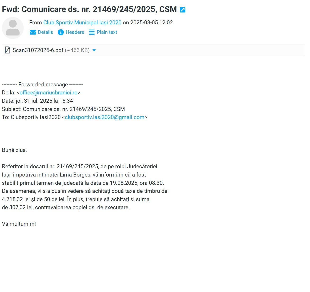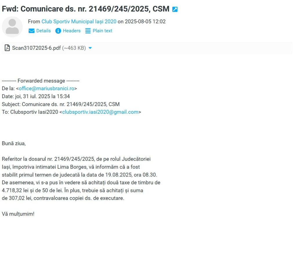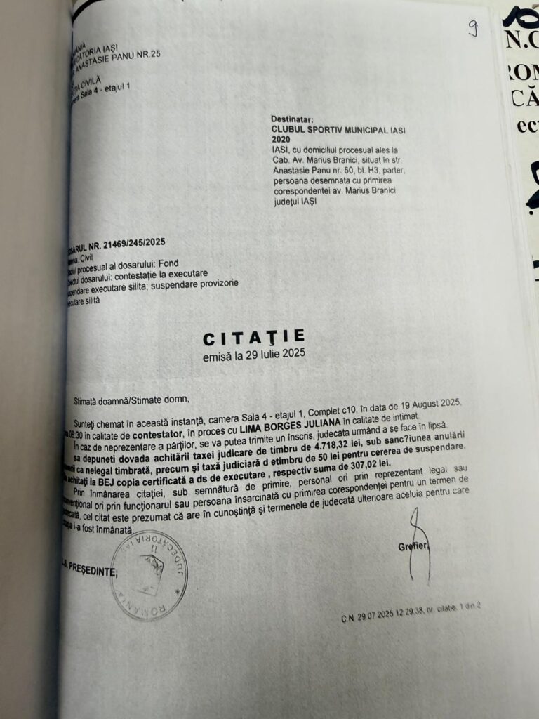 31 iulie 2025, la cabinetul avocatului Brănici sosește o citație pentru CSM Iași 2020 prin care instanța informează în privința fixării termenului de judecată pentru data de 19 august 2025 și asupra obligației de a achita două taxe de timbru în cuantum de 4.770 lei și 307 lei reprezentând contravaloarea xerocopierii dosarului de executare silită. În aceeași zi, avocatul Brănici trimite un email către CSM prin care informează asupra obligațiilor de plată a taxelor de timbru până la termenul de judecată