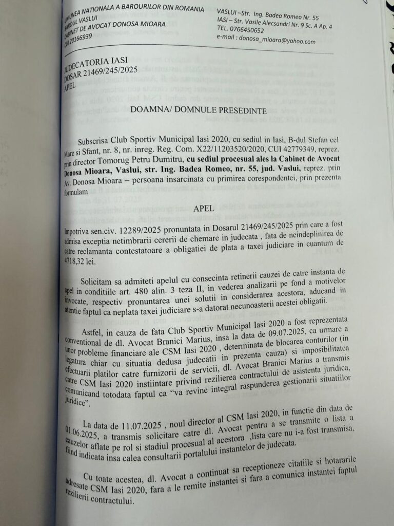 „Respingem categoric orice acuzație și nu reprezintă altceva decât o încercare de manipulare cu scopul de a masca propria culpă. Profesionalismul cu care ne-am îndeplinit obligațiile contractuale până la momentul la care am transmis notificarea de reziliere poate fi verificat prin soluțiile obținute în favoarea clubului sportiv, precum și prin corespondența și înscrisurile existente. În ceea ce privește citația din dosarul nr. 21469/245/2025, având ca obiect contestaţie la executare, în contradictoriu cu Lima Borges Juliana, arătăm că datele vehiculate sunt complet eronate și neconforme realității, situația de fapt fiind pe deplin dovedită prin înscrisuri. Citația a fost comunicată la sediul cabinetului în data de 31.07.2025. În aceeași zi am procedat la informarea CSM Iași 2020 prin intermediul corespondenței electronice utilizate constant pe întreaga durată a colaborării, comunicând atât existența citației, cât și obligațiile stabilite de către instanță în sarcina CSM Iași 2020, respectiv achitarea taxelor judiciare de timbru în cuantum de 4.718,32 lei și 50 lei, precum și suma de 307,02 lei reprezentând contravaloarea copiei dosarului de executare. A fost comunicată și informația privind fixarea primului termen de judecată pentru data de 19.08.2025, astfel încât a existat un termen mai mult decât rezonabil pentru îndeplinirea obligațiilor stabilite de instanță. Anterior împlinirii termenului, la data de 05.08.2025, s-a făcut o revenire cu o informare către CSM Iași 2020, reiterând obligațiile ce trebuiau îndeplinite. Abia la data de 18.08.2025, cu o zi înainte de termenul de judecată, un reprezentant al CSM Iași 2020 s-a prezentat la sediul cabinetului pentru ridicarea corespondenței. În concluzie, nu ne poate fi imputată în niciun fel soluția nefavorabilă a dosarului în cauză. Neîndeplinirea obligațiilor stabilite în sarcina CSM Iași 2020 de către instanță a condus în mod direct la anularea cererii ca netimbrată, lipsind astfel de orice finalitate demersul. În aceste condiții, orice încercare de a transfera responsabilitatea asupra noastră este vădit nefondată.” ne-a declarat avocatul Marius Brănici.