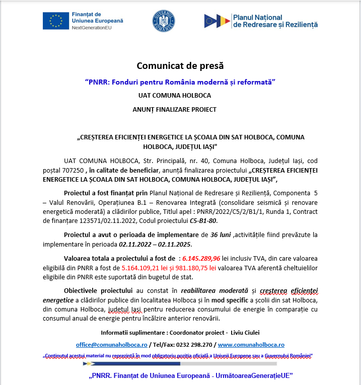 UAT COMUNA HOLBOCA, Str. Principală, nr. 40, Comuna Holboca, Județul Iași, cod poștal 707250 , în calitate de beneficiar, anunță finalizarea proiectului „CREȘTEREA EFICIENȚEI ENERGETICE LA ȘCOALA DIN SAT HOLBOCA, COMUNA HOLBOCA, JUDEȚUL IAȘI”,