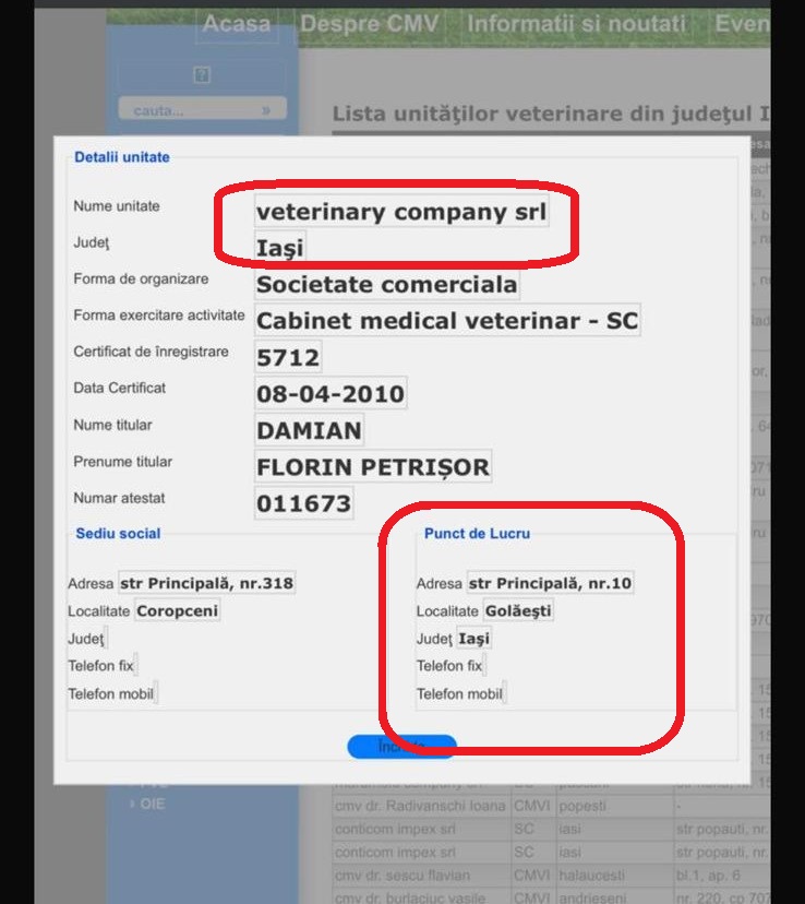 Firma Veterinary Company SRL a declarat un punct de lucru la o adresă din comuna Golăiești, reușind astfel să câștige contractul scos la licitație în anul 2024 de către DSVSA. La adresa declarată, strada Principală nr. 10, nu există însă niciun cabinet veterinar, ci doar o șură din lemn în mijlocul unui teren împrejmuit. Punctul de lucru a fost înregistrat încă din anul 2010, Colegiul Medicilor Veterinari din România eliberând în acest sens Certificatul cu nr. 5712, după cum rezultă din informațiile publicate pe site-ul instituției.