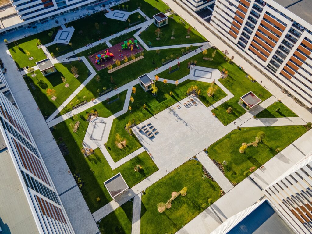 Adevărata atracție a ansamblului este grădina urbană de 20.000 mp, un spațiu verde impresionant, proiectat de arhitecți peisagiști de renume internațional. Designul său îmbină estetica modernă cu naturalețea peisajului local, rezultând un ambient ecologic, estetic și activ social.