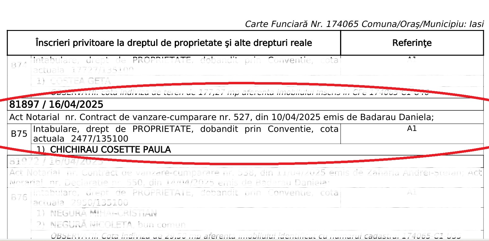 „Se menționează că din prețul total de 1.264.828 lei, cu TVA 19% inclus, echivalentul a 254.660 Euro, suma de 600.000 lei provine din donație, potrivit contractului de donație autentificat cu nr. 1376/23.08.2024, iar suma de 664.828,73 lei provine din fonduri proprii ale părții cumpărătoare”, se arată în contractul de vânzare-cumpărare semnat de către Cosette Chichirău în luna aprilie a anului trecut.