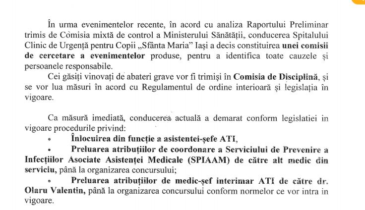 În urma deciziei Comitetului Director din data de 14.10.2025, conducerea secției ATI a fost înlocuită cu dl dr Olaru Valentin (medic șef interimar), acesta preluând activitatea secției cu data de 23.10.2025, odată cu revenirea din concediu de odihnă. Asistenta șefă este înlocuită cu dl asist. Bejenaru Andrei, începând cu 13.10.2025. Cu privire la informațiile despre ancheta efectuată de instituțiile abilitate, vă transmitem că acestea vor fi disponibile după finalizare. Vă mulțumim pentru înțelegere!”, a transmis conducerea unității medicale.