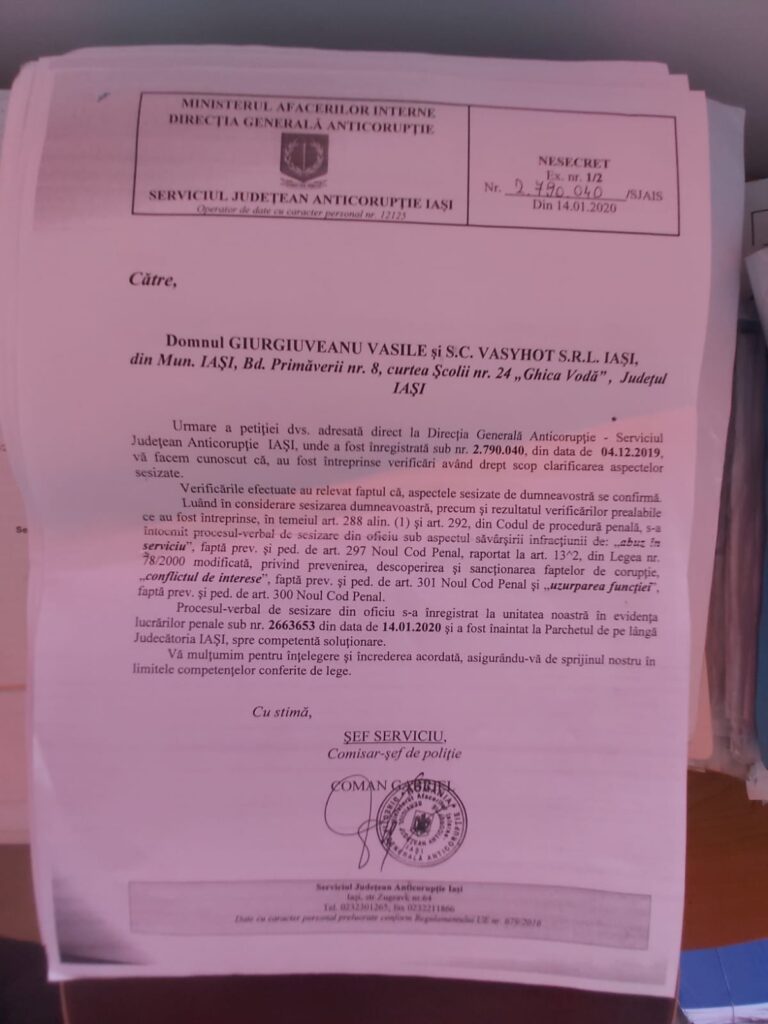 „Totodată, comisarul şef de poliţie Țibulcă Cătălin a întocmit răspunsul la petiţia 2790040/04.12.2019, transmis inculpatului Giurgiuveanu Vasile prin adresa S.J.A. Iaşi înregistrată cu numărul 2790040/14.01.2020, căruia i s-a comunicat că aspectele sesizate se confirmă, precum şi demersurile întreprinse la nivelul structurii anticorupţie, comunicare atipică în aceste situaţii”, consemnează procurorul Cristina Chiriac în rechizitoriul înaintat Tribunalului Iași.