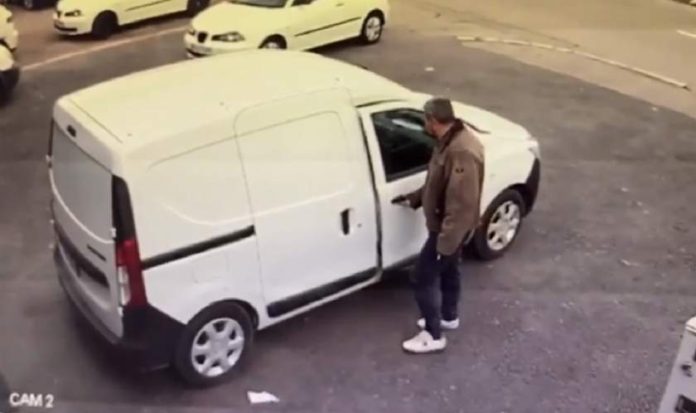 Pe camerele de supraveghere din zonă se vede cum fostul poliţist local dă târcoale maşinilor parcate, iar, la un moment dat, se îndreaptă spre o autoutilitară, deschide ușa din partea dreaptă, ia ceva de pe scaunul pasagerului și pleacă.