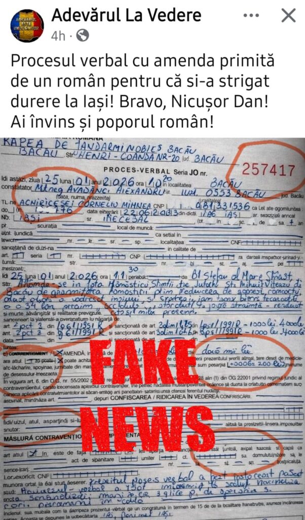 În mediul online au fost identificate imagini care prezintă un proces-verbal pretins a fi emis de Jandarmerie cu ocazia protestelor desfășurate la data de 24 ianuarie, document care, în realitate, nu reflectă conținutul unui proces-verbal autentic, fiind generat și modificat cu ajutorul inteligenței artificiale și care a generat în scurt timp sute de distribuiri și zeci de reacții.