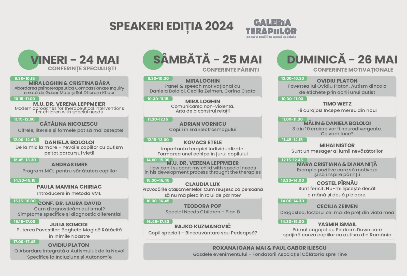 Galeria Terapiilor pentru copiii cu nevoi speciale, editia a treia, organizata de catre Asociatia Albert si zambete, care va avea loc in perioada 24-26 mai, va fi un eveniment platforma extraordinar reunind: 22 de speakeri printre care terapeuti, pedagogi si specialisti de renume national si international, si persoane cu dizabilitati in cadrul celor 3 conferinte: Conferinta specialistilor, pe 24 mai, Conferinta parintilor, pe 25 mai si Conferinta motivationala, pe 26 mai; 17 terapeuti, specialisti si organizatii resursa din domeniu, in cadrul galeriei de prezentare din Coresi Shopping Mall si ateliere pentru copii, in perioada 25-26 mai si peste 200 de participanti.