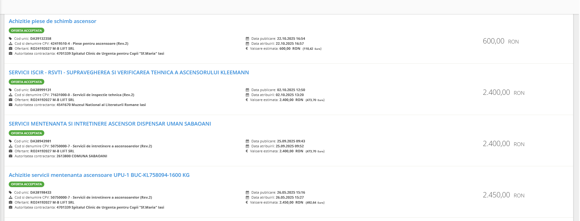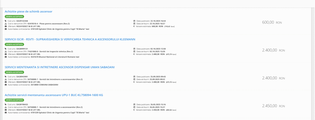 Cu toate că a intrat în insolvență, societatea lui Bogdan Crîșmaru a continuat să fie conectată la banii publici, la instituțiile controlate de către PNL. Chiar dacă pe piață sunt și alte firme cu același profil, instituțiile ieșene gestionate de capii PNL preferă societatea lui Crîșmaru, tocmai pe filiera de partid. Astfel, în anul 2025, firma M-B Lift SRL a încheiat 17 contracte în valoare de aproape 40.000 lei. Firma lui Crîșmaru a avut șase contracte cu Ateneul Național din Iași, instituție subordonată primăriei conduse de liberalul Mihai Chirica. Contractele au vizat mentenanța și întreținerea ascensoarelor de la sediul instituției.