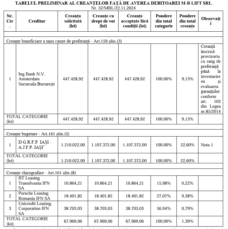 M-B Lift SRL: firmă în insolvență, cu datorii la stat, contracte cu instituții publice