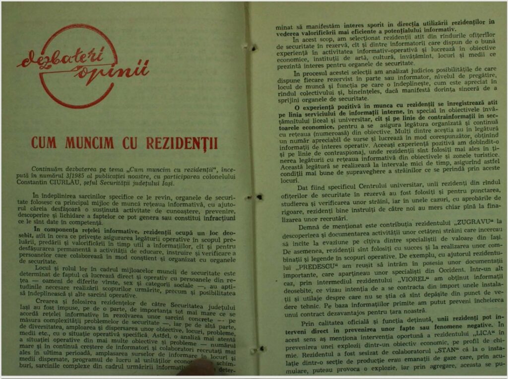 Într-un amplu articol tipărit într-unul din numere din 1985, șeful Securității Ieșene vorbește despre importanța colaborării dintre „rezident” și „informator”.