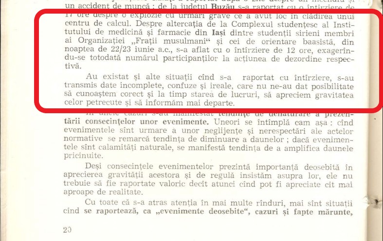 Într-un articol publicat în anul 1982, securiștii își puneau cenușă în cap pentru că au aflat cu o întârziere de 12 ore despre un conflict violent iscat în noaptea de 22/23 iunie 1982, în Complexul studențesc al Universității de Medicină din Iași, între „studenți sirieni membri ai Organnizației „Frații Musulmani” și cei de orientare baasist (referire la numele partidului politic sirian – n.r.)”