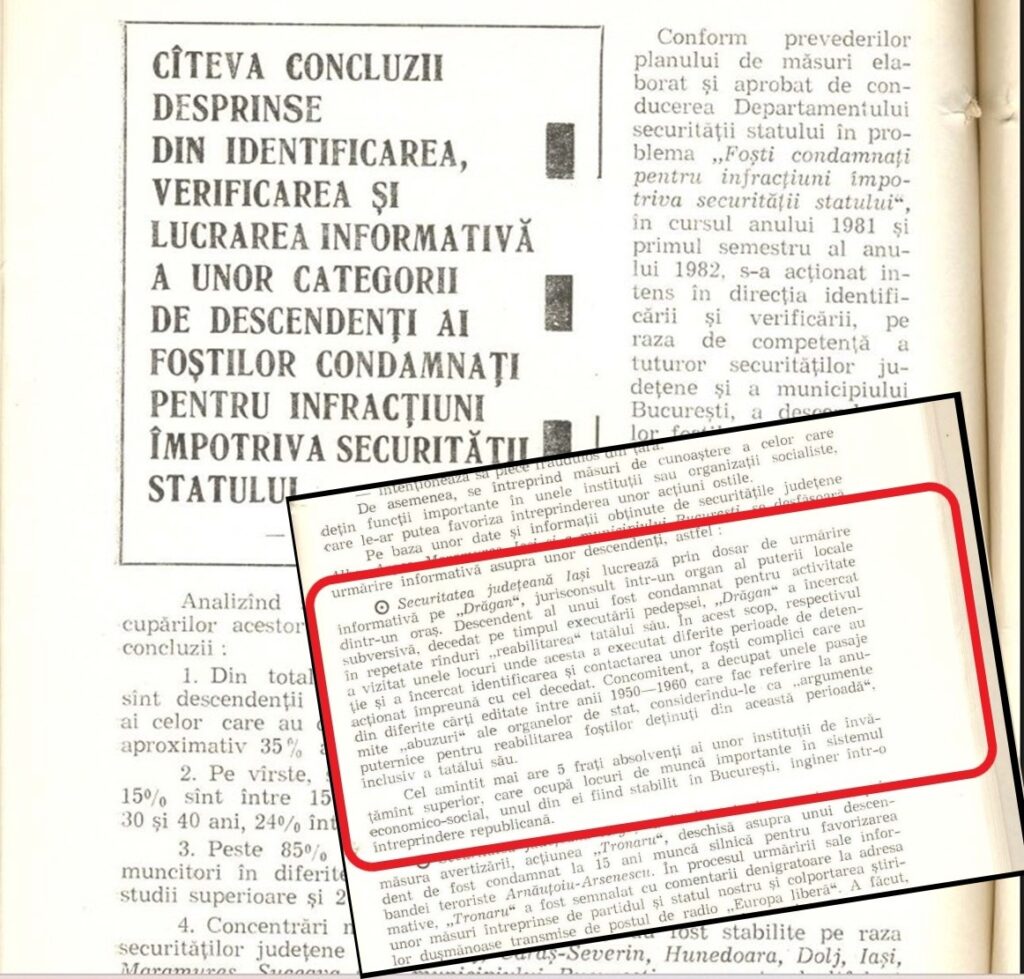 Iată care a fost titlul unui articol publicat în anul 1982 în Revista Securitatea: „Cîteva concluzii desprinse din identificarea, verificarea și lucrarea informativă a unor categorii de descendenți ai foștilor condamnați pentru infracțiuni împotriva securități statului”.