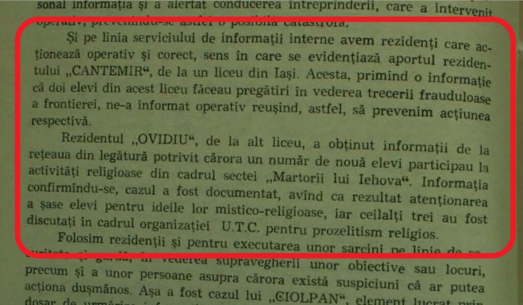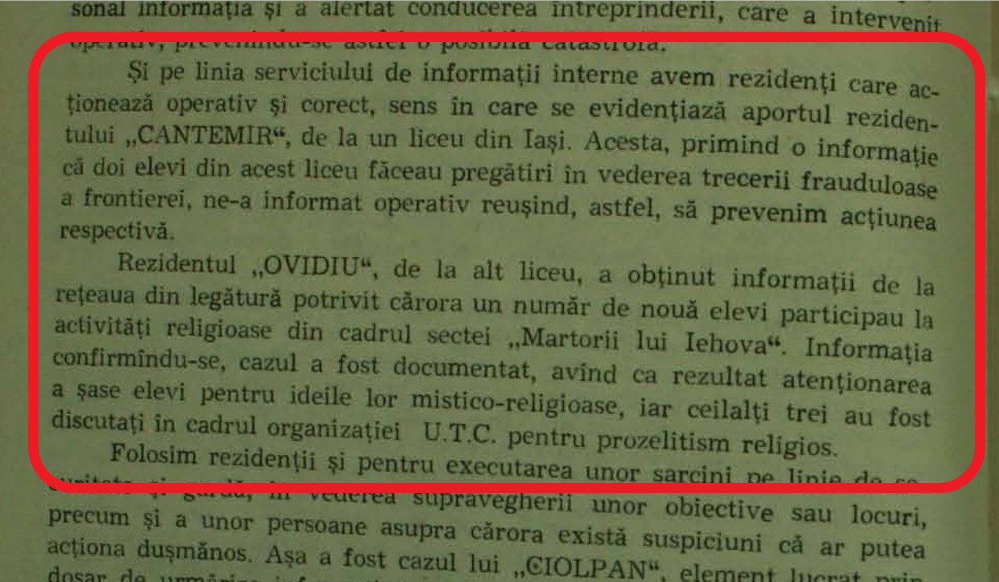 „Rezidentul „OVIDIU”, de la un alt liceu, a obținut informații de la rețeaua de legătură potrivit cărora un număr de nouă elevi participau la activități religioase în cadrul sectei „Martorii lui Iehova”. Informația confirmându-se, cazul a fost documentat, avînd ca rezultat atenționarea a șase elevi pentru ideile lor mistico-religioase, iar ceilalți trei au fost discutați în cadrul organizației U.T.C. pentru prozelitism religios”