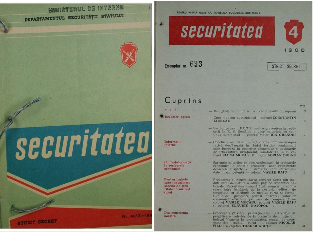 Între 1968 și 1989, Securitatea a tipărit o revistă cu caracter „strict secret” și destinată exclusiv ofițerilor care făceau parte din structura opresivă a regimului comunist. Unele articole aveau caracter „științific”: metode de violare a corespondenței, folosirea rețelelor de informatori sau tehnici de luptă în diverse situații. În alte articole, „editoriale” încadrate la rubrici de opinii, securiștii se lăudau cu rezultatele obținute în județele în care lucrau. 7IAȘI a consultat numerele „Revistei Securitatea”, publicate pe site-ul Consiliului Național pentru Studierea Arhivelor Securității (CNSAS), și a extras articolele în care ofițerii de informații din Iași relatau despre cazurile rezolvate sau despre problemele specifice județului. Colonelul Constantin Ciurlău, care a condus Inspectoratul Județean de Securitate Iași, se mândrea cum a prins elevi de liceu care plănuiau să fugă din țară sau care participau la „activități mistico-religioase ale sectei Martorii lui Iehova” și oferea lecții despre cum trebuie tratați informatorii de către securiști: „să fie buni interlocutori, volubili, amabili, afectivi, pentru că numai o asemenea comportare asigură consolidarea acelei punți sufletești, absolut necesare unei buni colaborări”. În Revista Securitatea, ofițerii descriau fără perdea cum urmăreau persoane, făceau racolări, despre oameni pe care i-au trimis la închisoare pentru că își exprimau opiniile sau despre cum descendenți ai deținuților politici erau urmăriți pentru păcatul de a se fi născut într-o anumită familie. Mihai Demetriade, consilier superior CNSAS: „Revista avea un caracter clasificat, doar pentru ofițerii care aveau acces la informații „strict secret”. Intenția acestei publicații era de instruire operativă a ofițerilor de informații”