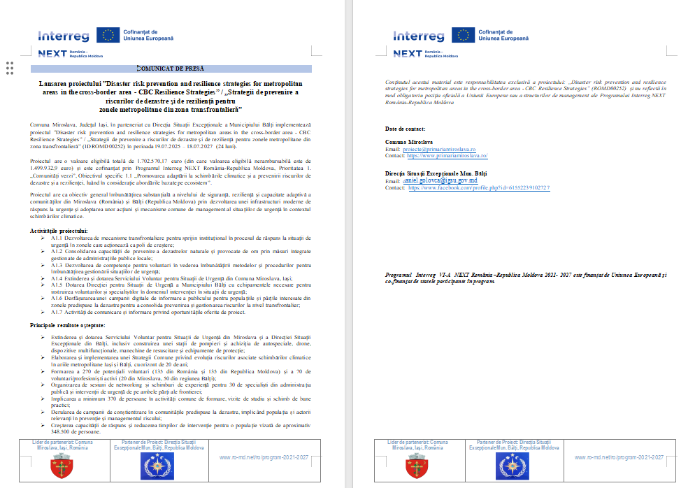 Comuna Miroslava, Județul Iași, în parteneriat cu Direcția Situații Excepționale a Municipiului Bălți implementează proiectul ”Disaster risk prevention and resilience strategies for metropolitan areas in the cross-border area – CBC Resilience Strategies” / „Strategii de prevenire a riscurilor de dezastre și de reziliență pentru zonele metropolitane din zona transfrontalieră” (ID ROMD00252) în perioada 19.07.2025 – 18.07.2027 (24 luni).