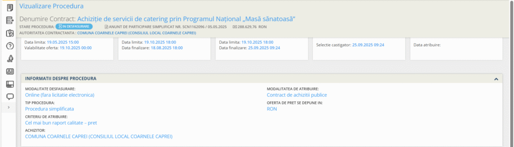 Procedura organizată pentru atribuirea contractului de catering pentru perioada mai 2025 – decembrie 2025 s-a transformat într-o mascaradă. Licitația a fost tergiversată luni la rând, perioadă în care serviciul de catering a fost asigurat tot de firma lui Valentin Bărboi.