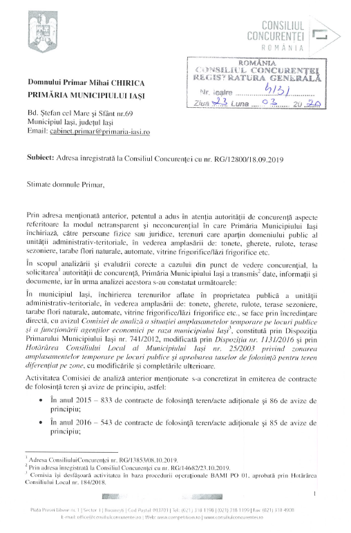 În 2020, după o sesizare făcută de fostul consilier local Răzvan Timofciuc, Consiliul Concurenței a inițiat un control la Primăria Iași. Inspectorii instituției au constatat că la Iași concurența reală este eliminată prin acest criteriu al închirierii directe și a cerut impunerea unor măsuri.