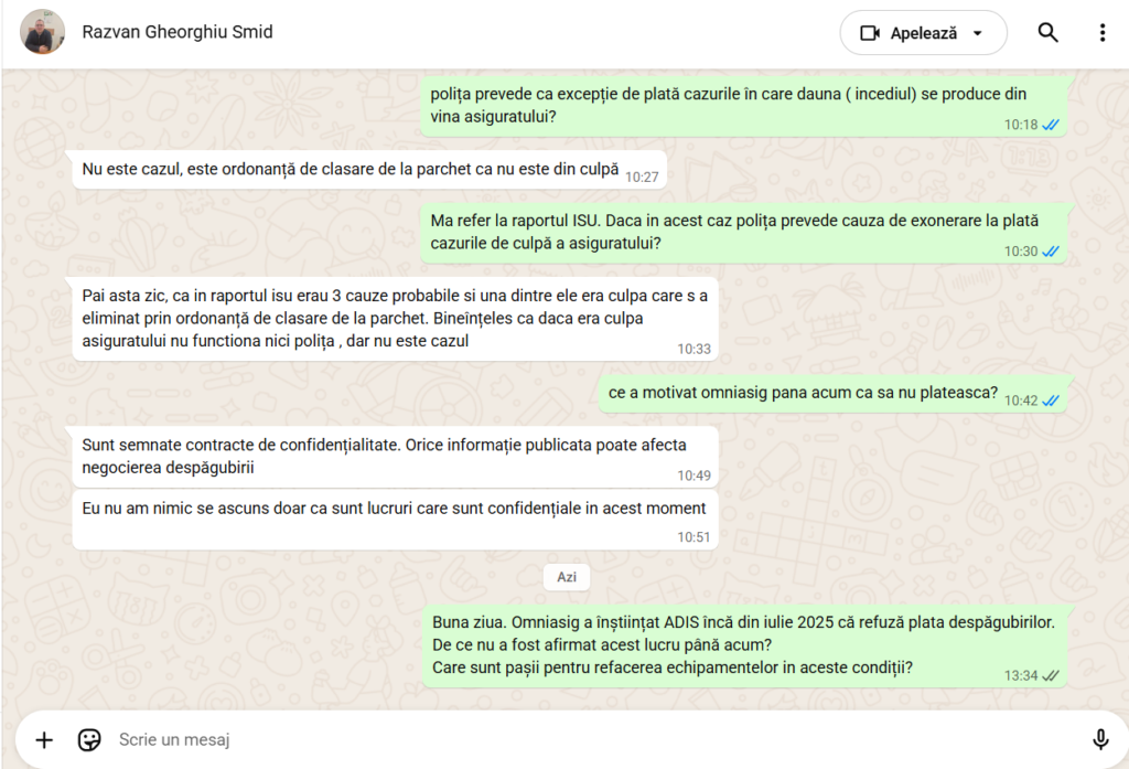 Jurnaliștii 7IAȘI au cerut explicații suplimentare de la acesta. În discuțiile purtate pe WhatsApp, Răzvan Gheorghiu a continuat să susțină aceleași aspecte. Pe 26 februarie 2026, 7IAȘI a cerut detalii privind excepția de la plata daunelor dacă incidentul a fost produs din vina asiguratului. Și de această dată, Gheorghiu a evitat răspunsul, făcând trimitere la ordonanța de clasare dată de Parchet. Gheorghiu a evidențiat că dacă era vina asiguratului (adică a Edil Industry SRL – n.r.), Omniasig nu ar fi plătit, dar a menționat că nu e cazul. Asta, deși Omniasig s-a bazat pe raportul celor de la ISU, care a demonstrat că vina o poartă cel care gestionează stația, adică Edil Industry SRL.