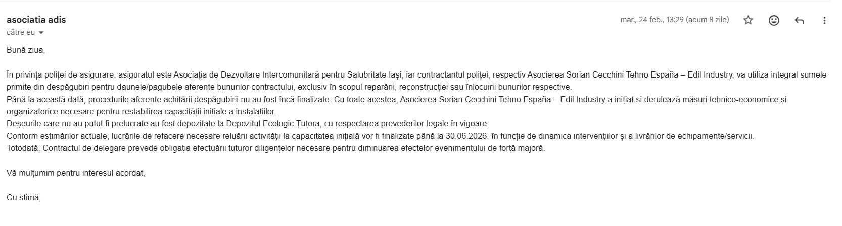 „În privința poliței de asigurare, asiguratul este Asociația de Dezvoltare Intercomunitară pentru Salubritate Iași, iar contractantul poliței, respectiv asocierea Sorrain Cecchini Tehno España – Edil Industry, va utiliza integral sumele primite din despăgubiri pentru daunele/pagubele aferente bunurilor contractului, exclusiv în scopul reparării, reconstrucției sau înlocuirii bunurilor respective. Până la această dată, procedurile aferente achitării despăgubirii nu au fost înca finalizate”, a precizat Răzvan Gheorghiu într-un răspuns către 7IAȘI din data de 24 februarie 2026.