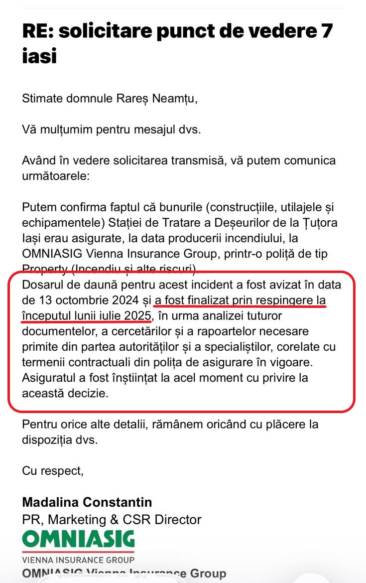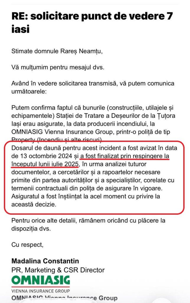 „Putem confirma faptul că bunurile (construcțiile, utilajele și echipamentele) Stației de Tratare a Deșeurilor de la Țuțora – Iași erau asigurate, la data producerii incendiului, la OMNIASIG Vienna Insurance Group, printr-o poliță de tip Property (Incendiu și alte riscuri).