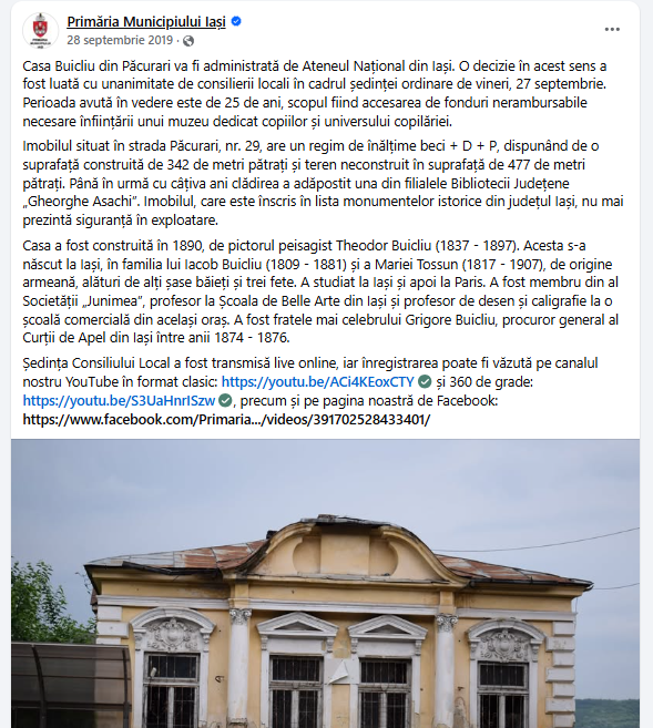 „Casa Buicliu va deveni Muzeul Copiilor. Primarul Mihai Chirica a semnat autorizația de construire necesară executării lucrărilor de consolidare și refuncționalizare a Casei Buicliu din Păcurari pentru a fi transformată într-un Muzeu al Copiilor. Documentul a fost solicitat de Ateneul Național din Iași, cel care a preluat imobilul în administrare în anul 2019 și care caută o sursă de finanțare pentru realizarea proiectului”, au menționat cei de la Primăria Iași.