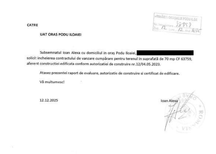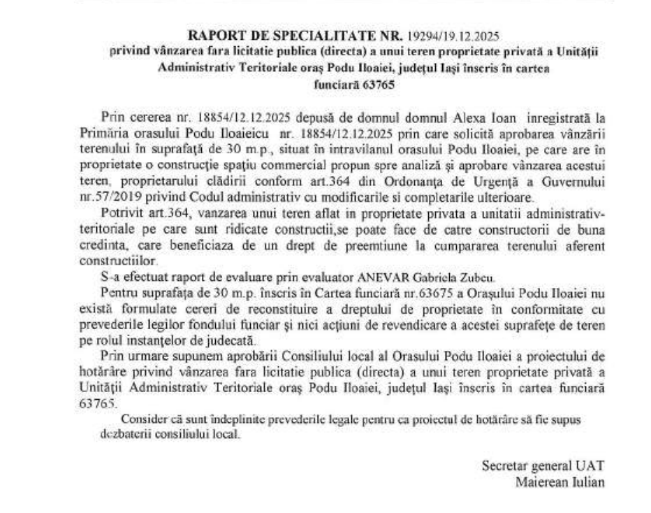 „Având în vedere faptul că terenul este aferent unei construcții existente, se propune vânzarea directă, în condițiile prevăzute de Codul administrativ, cu aprobarea Consiliului Local al orașului Podu Iloaiei. Față de cele prezentate, vânzarea terenului proprietate privată a orașului Podu Iloaiei, aferent unei construcții existente, este oportună din punct de vedere economic, financiar, social și urbanistic, contribuind la valorificarea eficientă a patrimoniului unității administrativ teritoriale și la dezvoltarea locală”, se arată în proiectul de hotărâre inițiat de viceprimarul Surugiu.