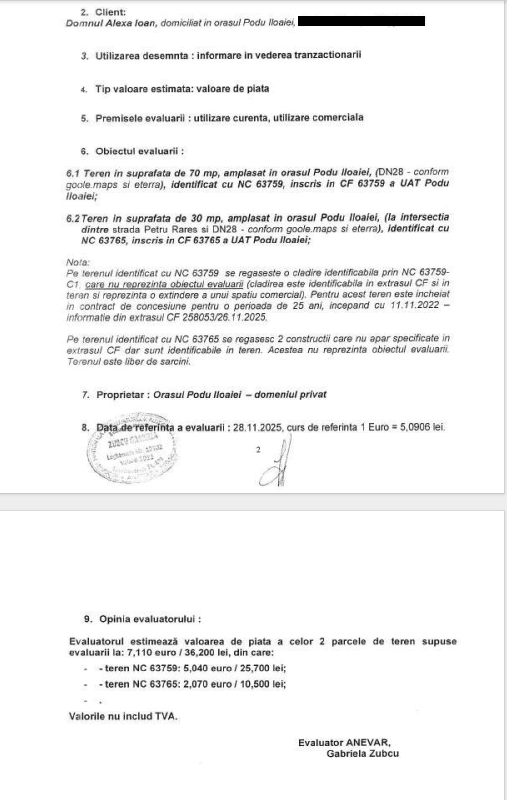 Suprafața cumpărată este de 100 mp, împărțită în două parcele, una de 70 și una de 30 mp. Terenul de 70 mp a fost evaluat la 5.040 euro ( 25.700 lei), la 72 euro mp, iar cel de 30 mp a fost evaluat la 2.070 de euro (69 euro mp)-10.500 lei. Per total, valoarea e de 7.110 euro. Evaluarea a fost întocmită de Gabriela Zubcu, expert evaluator ANEVAR cu care primăria a încheiat un contract. Motivația înstrăinării terenurilor a fost aceea că fiind sub 150 mp nu pot fi construire, astfel încât pot fi vândute. „Terenurile sunt amplasate în zona centrală a orașului, în imediata apropiere a parcului central din Podu Iloaiei, respectiv la intersecția dintre strada Petru Rareș și DN28/DE 583. Suprafața celor două parcele nu permite utilizarea individuală a acestora pentru a fi construite. Suprafața minimă a unui teren pentru a fi construit este de 150 mp, conform informațiilor din certificatul de urbanism”, se arată în raportul de evaluare însușit de primărie.