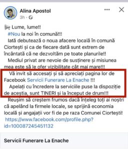 Ca și cum nu erau de-ajuns tarantelele ei feisbucice cu dungi hipstero-anglofoane, la pachet cu manevrele bugetar-manglofoane, aducătoare de parale bune în buzunarele atent desemnate, tanti coana preoteasa di Ciortești s-o gîndit ie, cu mintea ii, ș-o scos pi piață o nouă perlă di intelijență, bun sîmț & penibil baban : s-o apucat sî facî reclamî unei firme de îngropăciuni.