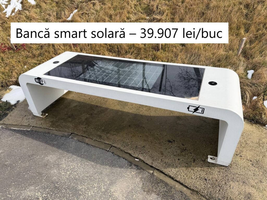 Pentru Zona de Agrement C.A. Rosetti au fost achiziționate două tipuri de bănci „inteligente”, adică cu conexiune wi-fi, port USB și cu încărcare solară. Un model a costat 30.236 lei/buc + TVA. Șapte astfel de bănci au fost cumpărate. Alte patru bănci la 39.907 lei/buc + TVA au fost achiziționate pentru același obiectiv. Modelul din imagine este comercializat în mediul on-line cu aproximativ 15.000 lei/buc, adică de trei ori mai puțin decât a plătit primăria.