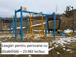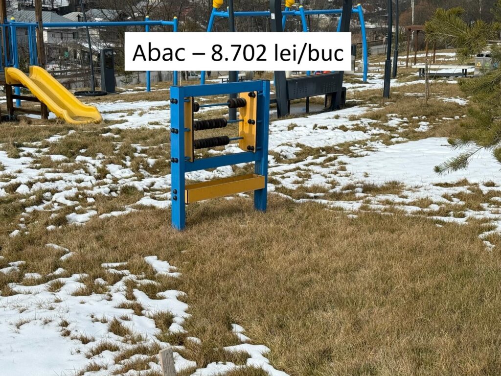 „Panou loc joacă abac” este numele de inventar atribuit dispozitivului din imagine. Au fost achiziționate patru astfel de echipamente de joacă la prețul de 8.702 lei/buc+TVA. Un echipament similar se găsește pe internet la prețuri de 1.000 – 1.500 lei/buc.