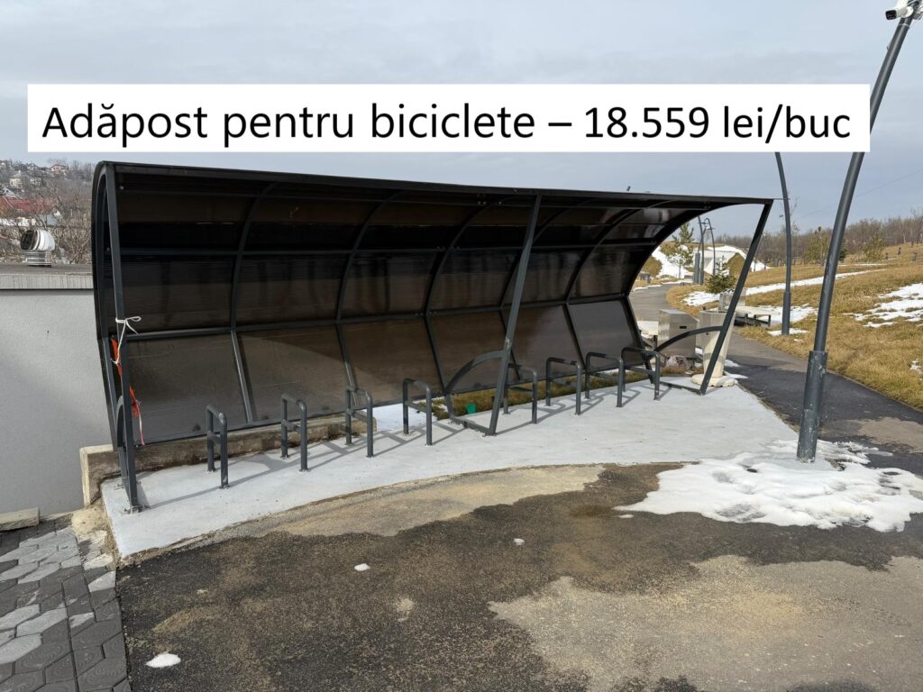 Trei astfel de rasteluri – „adăposturi pentru biciclete” au fost achiziționate pentru același parc din C.A.Rosetti cu 18.559 lei+TVA/bucata. Pe internet, produse identice se găsesc la prețul de 8.000 de lei+TVA.